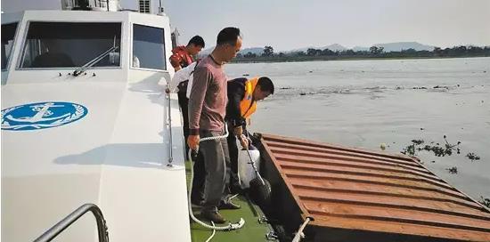 2月18日上午11点,应急人员发现“藤县风顺0808”船开始进水向右侧倾斜,可能发生油污泄漏事故。发现该险情后,应急人员立即报告。江门海上搜救分中心接报后立即向上级部门报告险情,并指定“海巡09438”船为现场应急指挥船,采取措施固定船体、固定漂浮的空集装箱,防止漂向航道。